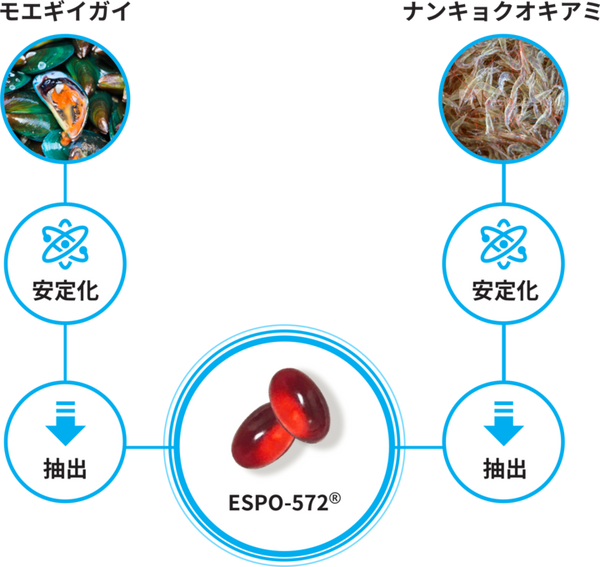 ナンキョクオキアミから抽出した、オメガ3脂肪酸を多く含む天然のクリルオイル。リン脂質結合型の脂肪酸であるため、体内に吸収されやすいのが特徴で、PCSO-524にクリルオイルをブレンドしたESPO-572は、PCSO-524をパワーアップさせたオイルです。